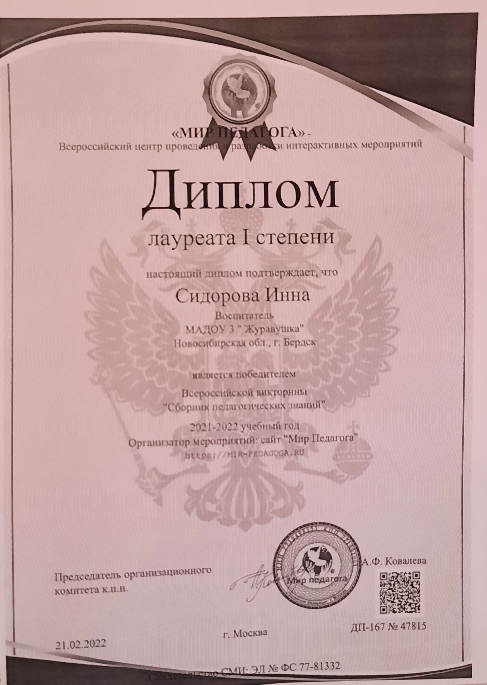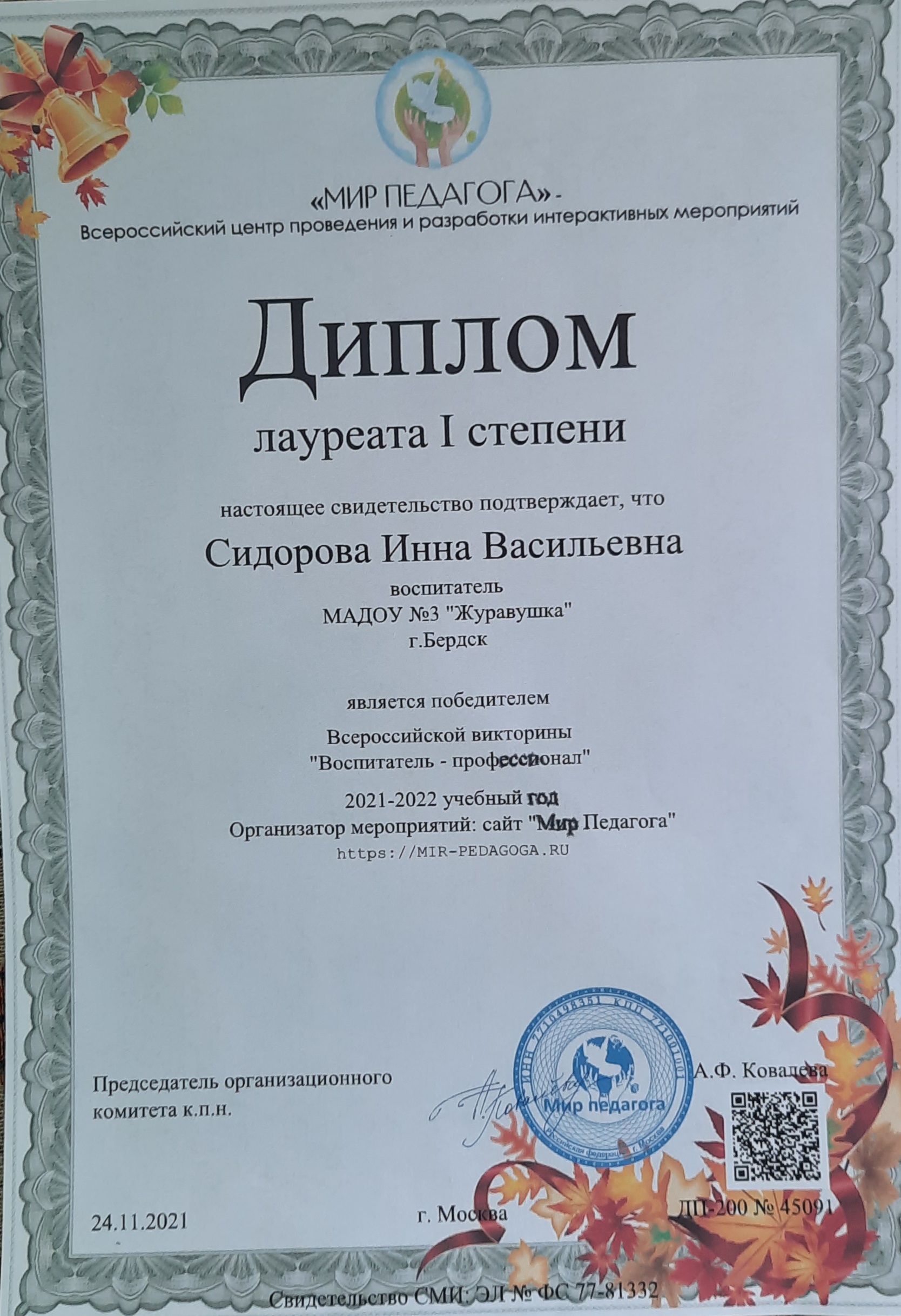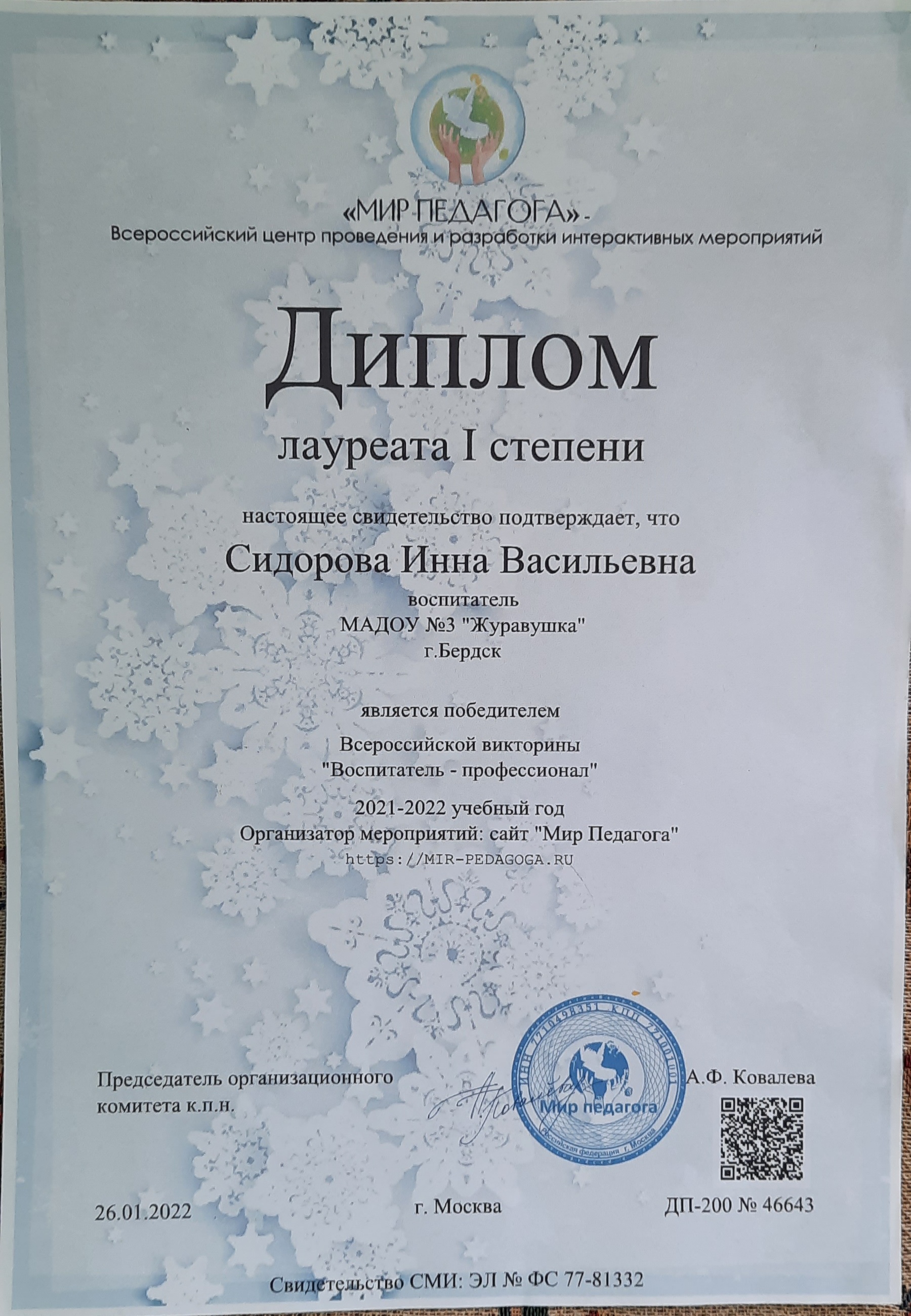 диплом лауреата 1 степени Всероссийской викторины " Воспитатель-профессионал"