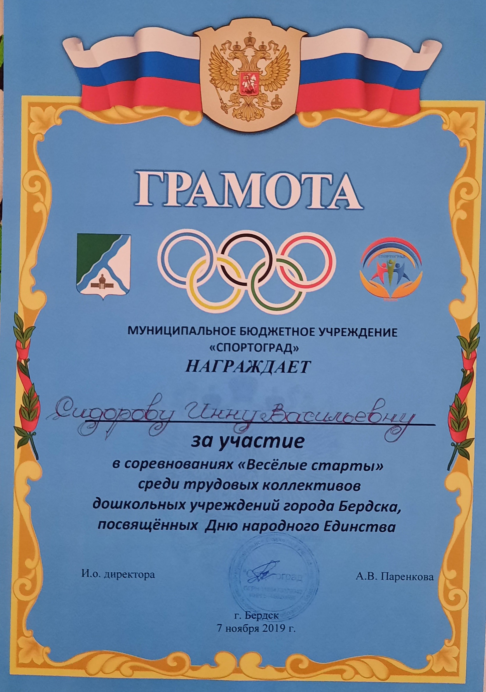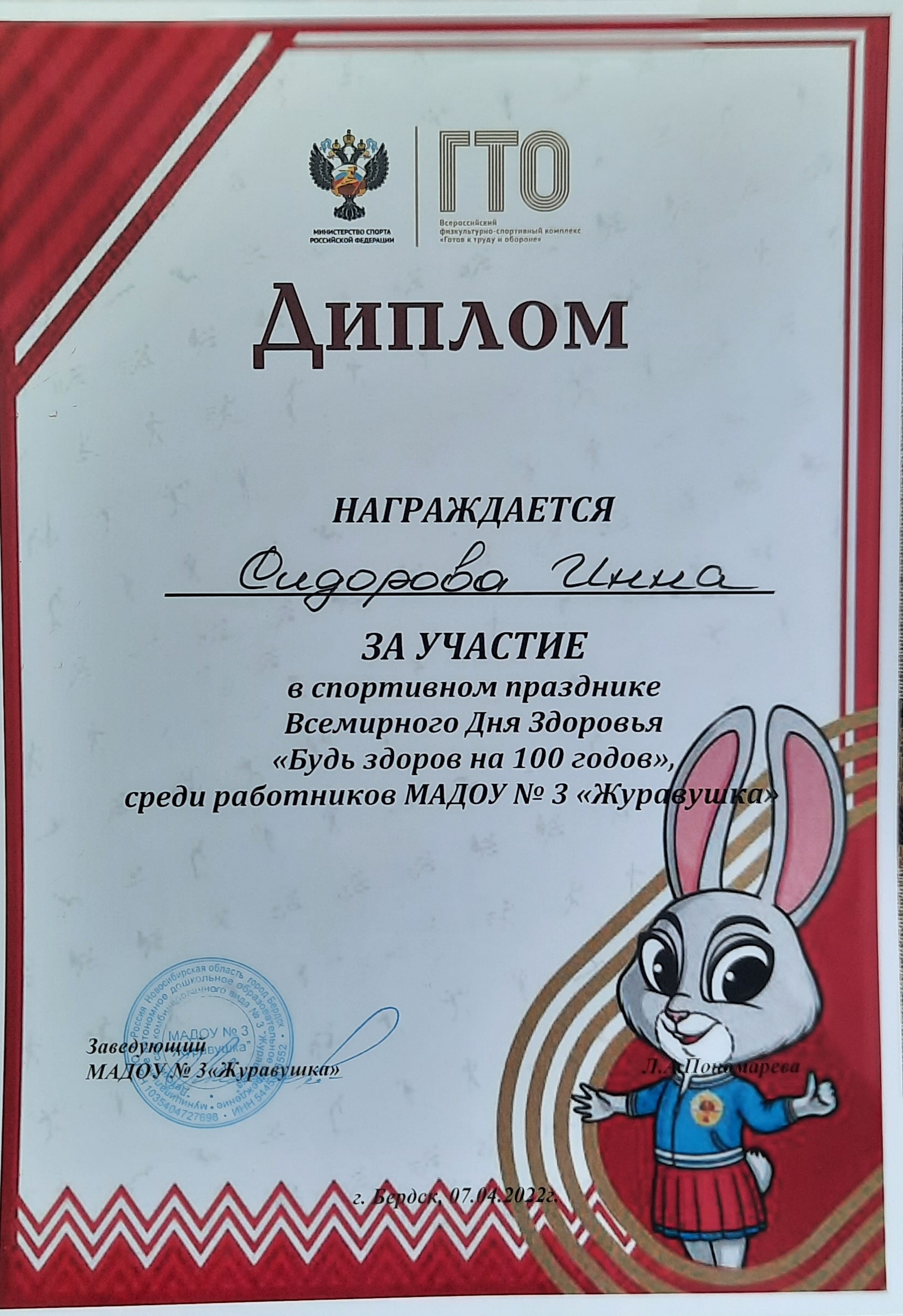 диплом за участие в спортивном празднике " Будь здоров на 100 годов"