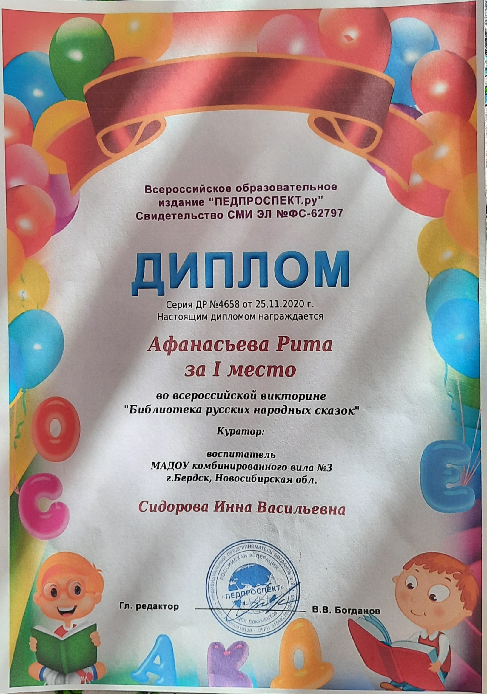 диплом за 1 место Афанасьевой Риты, во всероссийской викторине " Библиотека русских народных сказок"