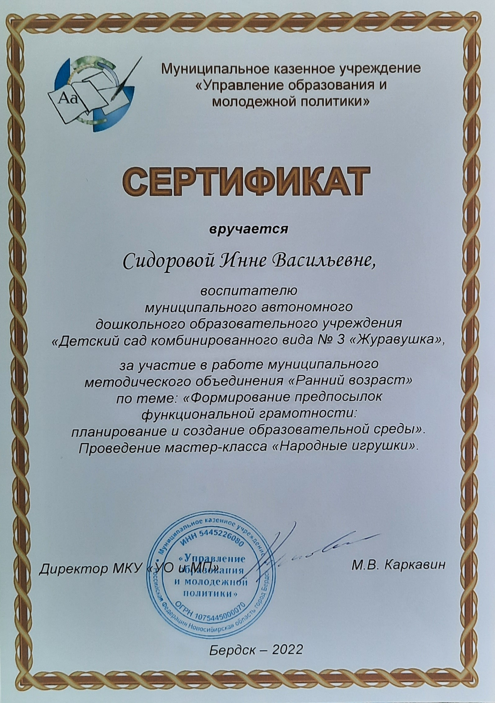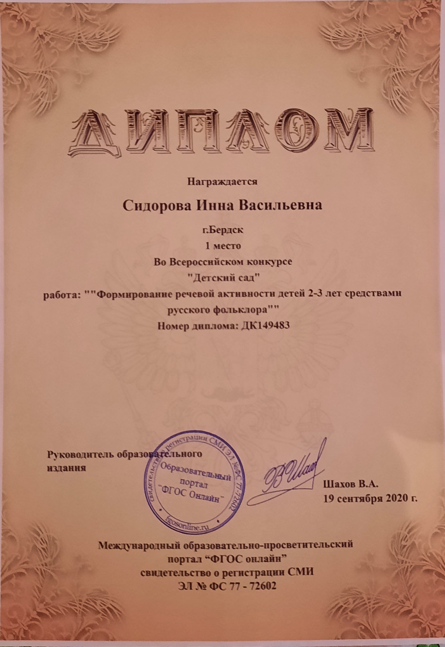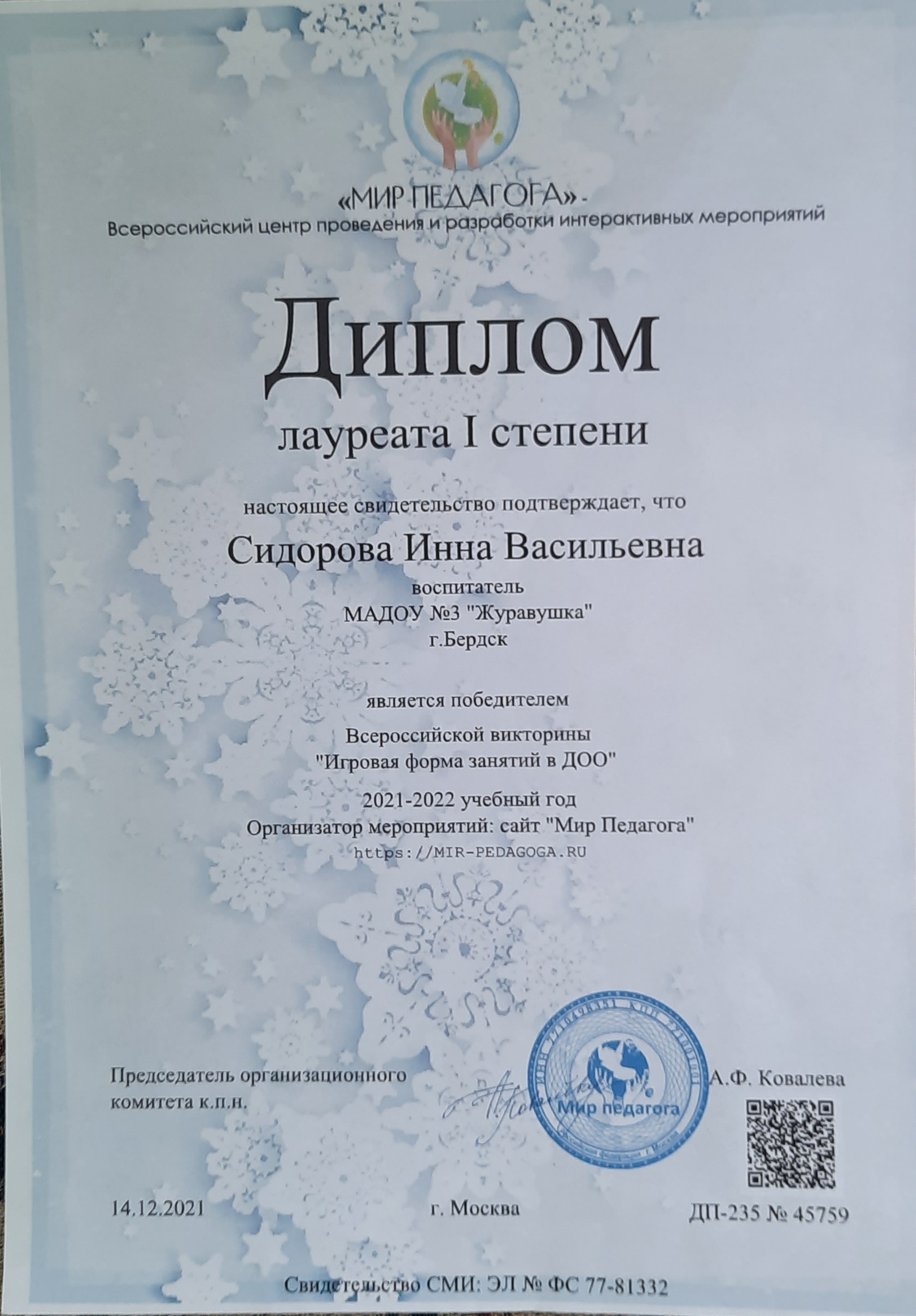диплом лауреата 1 степени Всероссийской викторины " игровая форма занятий в ДОО"